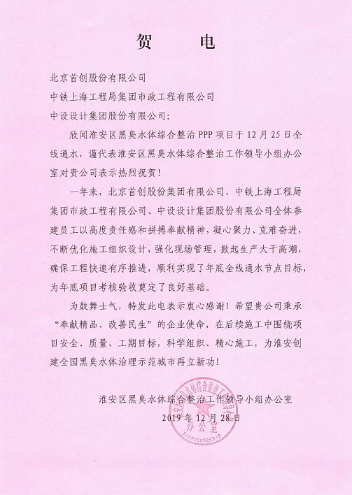 寒冬臘月,2020辭舊迎新之際,一封來自淮安區(qū)黑臭水體綜合整治工作領導小組辦公室的賀電,在高度肯定和贊揚之余,更給首創(chuàng)股份,以及淮安首創(chuàng)團隊帶來了一絲暖意。 賀電中,整治辦對首創(chuàng)股份、淮安首創(chuàng)生態(tài)環(huán)境有限公司及堅持奮戰(zhàn)在一線的同事們表示誠摯的敬意和衷心的感謝,并就項目給予了首創(chuàng)股份很高的期望。 地處...