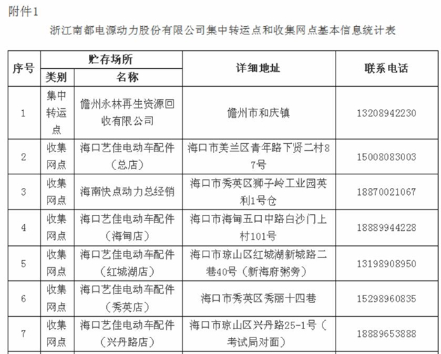 依據(jù)《海南省鉛蓄電池生產(chǎn)企業(yè)集中收集和跨區(qū)域轉(zhuǎn)運(yùn)制度試點(diǎn)工作方案》,經(jīng)審查和研究確定浙江南都電源動(dòng)力股份有限公司、浙江天能環(huán)??萍加邢薰?、安徽力普拉斯電源技術(shù)有限公司、海南超能梯次再生資源有限公司、風(fēng)帆有限責(zé)任公司等5家公司為廢鉛蓄電池試點(diǎn)單位。現(xiàn)將試點(diǎn)單位集中轉(zhuǎn)運(yùn)點(diǎn)名稱與聯(lián)系方式、收集網(wǎng)點(diǎn)名稱與...