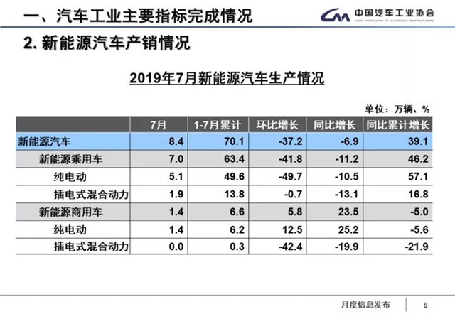 8月12日,中汽協(xié)發(fā)布2019年7月汽車行業(yè)產(chǎn)銷數(shù)據(jù),其中,新能源汽車產(chǎn)銷分別完成8.4萬輛和8萬輛,比上年同期分別下降6.9%和4.7%。 按類型來看,7月份純電動汽車生產(chǎn)完成6.5萬輛,比上年同期下降4.8%,銷售完成6.1萬輛,比上年同期增長1.6%;插電式混合動力汽車產(chǎn)銷分別完成2萬輛和1....