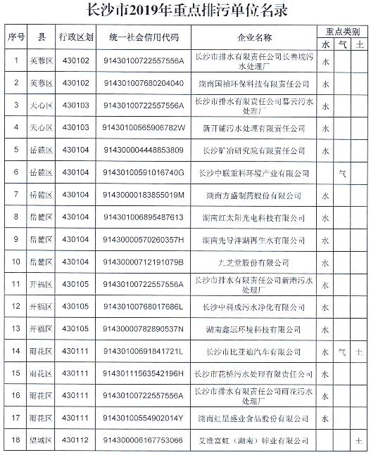 2019年5月22日,長沙市生態(tài)環(huán)境局印發(fā)了《長沙市2019年重點排污單位名錄》,涉及單位共99家,污水排污單位為主。
