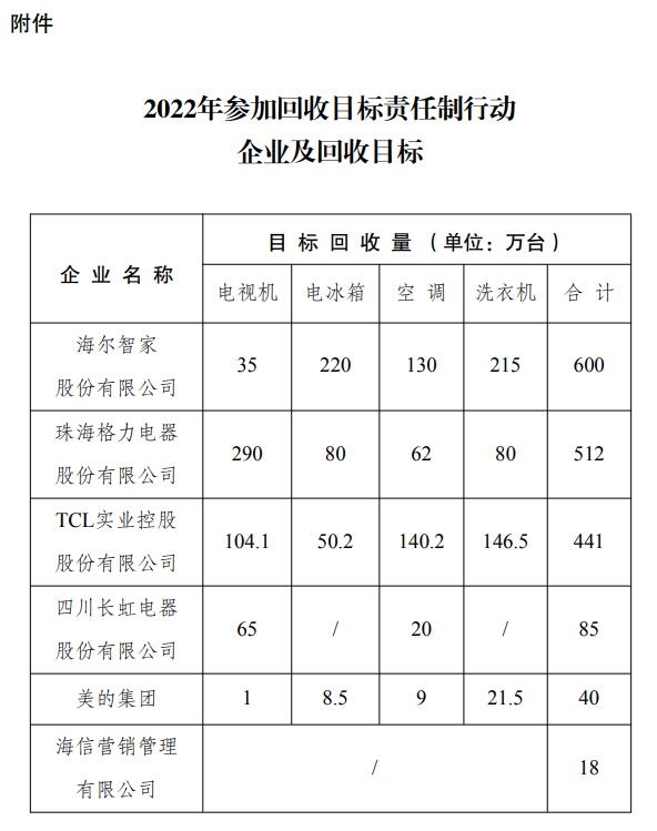 國(guó)家發(fā)展改革委辦公廳 工業(yè)和信息化部辦公廳生態(tài)環(huán)境部辦公廳關(guān)于做好2022年家電生產(chǎn)企業(yè)回收目標(biāo)責(zé)任制行動(dòng)有關(guān)工作的通知發(fā)改辦產(chǎn)業(yè)〔2022〕424號(hào) 各省、自治區(qū)、直轄市及計(jì)劃單列市、新疆生產(chǎn)建設(shè)兵團(tuán)發(fā)展改革委、工業(yè)和信息化主管部門、生態(tài)環(huán)境廳(局): 為暢通和優(yōu)化家電生產(chǎn)流通消費(fèi)和回收利用渠道,...