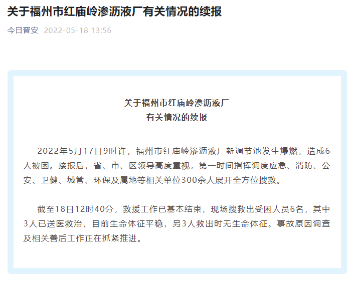 據(jù)福州市晉安區(qū)人民政府辦公室消息,5月17日9時(shí)許,福州市紅廟嶺滲瀝液廠新調(diào)節(jié)池發(fā)生爆燃,造成6人被困。接報(bào)后,福建省、福州市、晉安區(qū)領(lǐng)導(dǎo)高度重視,第一時(shí)間指揮調(diào)度應(yīng)急、消防、公安、衛(wèi)健、城管、環(huán)保及屬地等相關(guān)單位300余人展開全方位搜救。截至18日12時(shí)40分,救援工作已基本結(jié)束,現(xiàn)場(chǎng)搜救出受困人...
