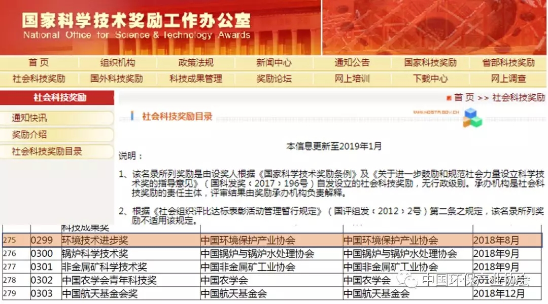 “環(huán)境技術(shù)進步獎”正式納入國家科學(xué)技術(shù)獎勵工作辦公室發(fā)布的《社會科技獎勵目錄》