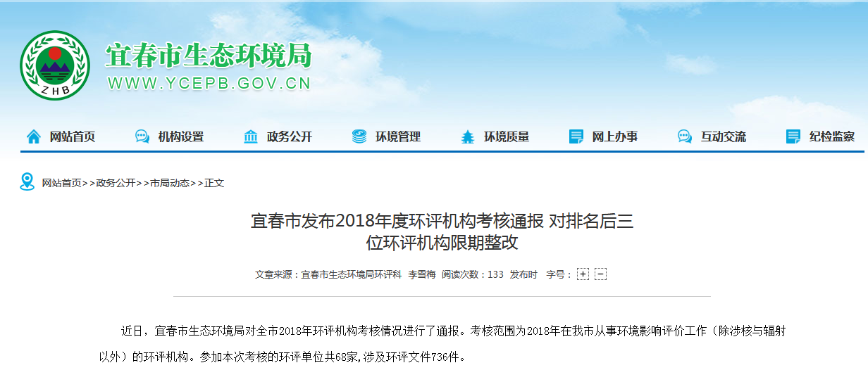 宜春市發(fā)布2018年度環(huán)評機構(gòu)考核通報 對排名后三位環(huán)評機構(gòu)限期整改