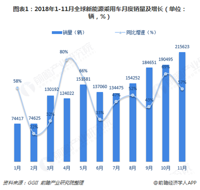 中國新能源乘用車市場最大 目前,全球各國雖然在新能源汽車研發(fā)側(cè)重點不同,但都制定了較為明確的發(fā)展路線,并且有相對完善的研發(fā)、推廣體系和一系列政府政策支持。正因此,全球新能源汽車行業(yè)保持快速發(fā)展態(tài)勢。 根據(jù)GGII數(shù)據(jù),2018年1-11月,全球新能源乘用車月度銷量增速均在20%以上。其中,2018年...