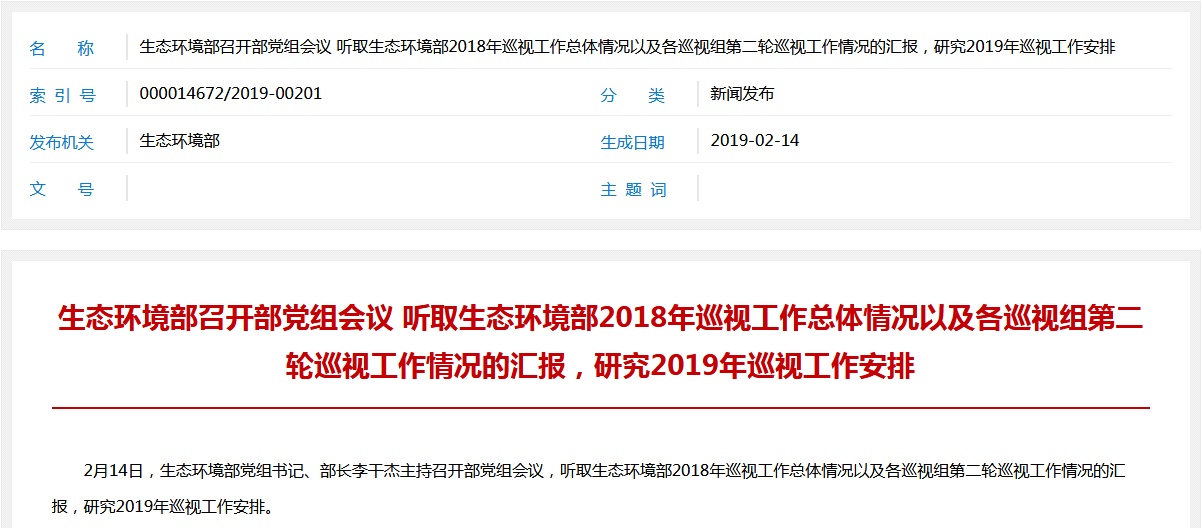 2月14日,生態(tài)環(huán)境部黨組書記、部長李干杰主持召開部黨組會議,聽取生態(tài)環(huán)境部2018年巡視工作總體情況以及各巡視組第二輪巡視工作情況的匯報,研究2019年巡視工作安排。會議指出,巡視工作是落實全面從嚴(yán)治黨主體責(zé)任、加強(qiáng)領(lǐng)導(dǎo)班子和干部隊伍建設(shè)的重要抓手。黨的十九大以來,生態(tài)環(huán)境部黨組研究制定巡視工作五...