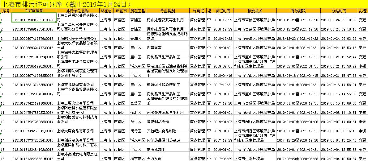 上海市排污許可證庫(截止2019年1月24日)