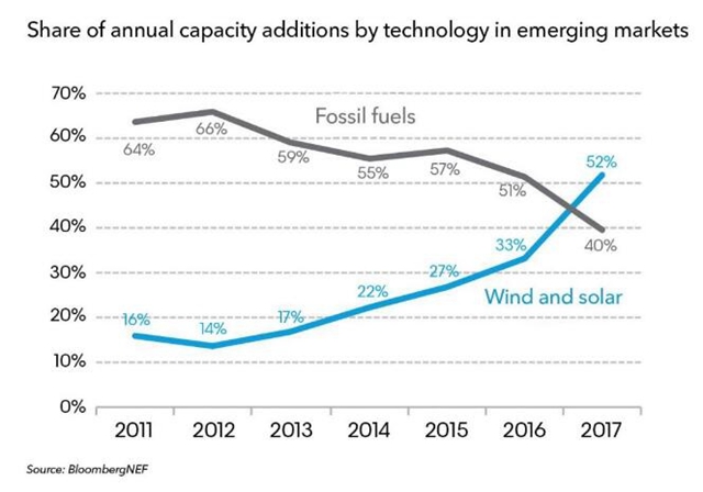 電力需求的激增、技術(shù)成本的下降以及政策制定的創(chuàng)新已使發(fā)展中國家取代發(fā)達(dá)國家,成為全球清潔能源的領(lǐng)導(dǎo)者。截止到2017年,發(fā)展中國家新增了114GW的各類零碳發(fā)電機,僅風(fēng)電和太陽能新增發(fā)電裝機規(guī)模就達(dá)到歷史新高的94GW。同時,新增燃煤發(fā)電裝機規(guī)模為2006年以來最低。2017年新建煤電裝機量為48G...