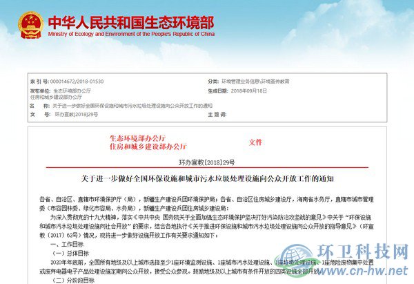 9月18日,生態(tài)環(huán)境部辦公廳與住房和城鄉(xiāng)建設(shè)部辦公廳聯(lián)合印發(fā)《關(guān)于進(jìn)一步做好全國環(huán)保設(shè)施和城市污水垃圾處理設(shè)施向公眾開放工作的通知》(以下簡稱《通知》)?!锻ㄖ芬螅?020年年底前,全國所有地級及以上城市選擇至少1座環(huán)境監(jiān)測設(shè)施、1座城市污水處理設(shè)施、1座垃圾處理設(shè)施、1座危險廢物集中處置或廢棄...