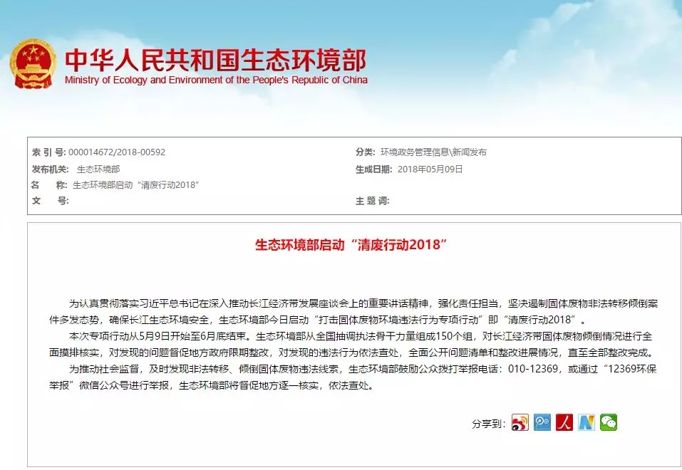 為遏制長江流域固體廢物非法轉(zhuǎn)移傾倒案件多發(fā)態(tài)勢,及時(shí)消除環(huán)境安全隱患,保障長江生態(tài)環(huán)境安全,生態(tài)環(huán)境部決定組織開展打擊固體廢物環(huán)境違法行為專項(xiàng)行動。從有關(guān)?。▍^(qū)、市)環(huán)保系統(tǒng)抽調(diào)人員,組成150個(gè)專項(xiàng)行動督查組,對長江經(jīng)濟(jì)帶11?。ㄊ校?400多個(gè)固體廢物堆存點(diǎn)位進(jìn)行現(xiàn)場核查督導(dǎo)。這場名為“清廢行動...