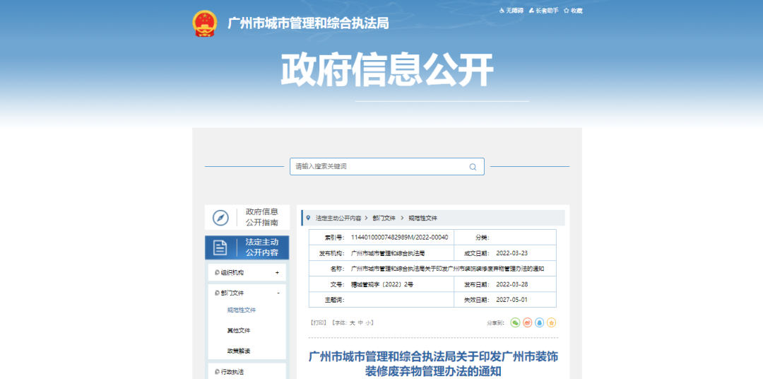為推動(dòng)裝飾裝修廢棄物規(guī)范化處置,維護(hù)城市管理秩序和市容環(huán)境衛(wèi)生,促進(jìn)裝飾裝修廢棄物綜合利用,2022年3月28日,廣州市城市管理和綜合執(zhí)法局發(fā)布了《廣州市裝飾裝修廢棄物管理辦法》。 《辦法》適用于居民住宅裝飾裝修工程以及投資額不超過(guò)100萬(wàn)元(含100萬(wàn)元)或者建筑面積不超過(guò)500平方米(含500平...
