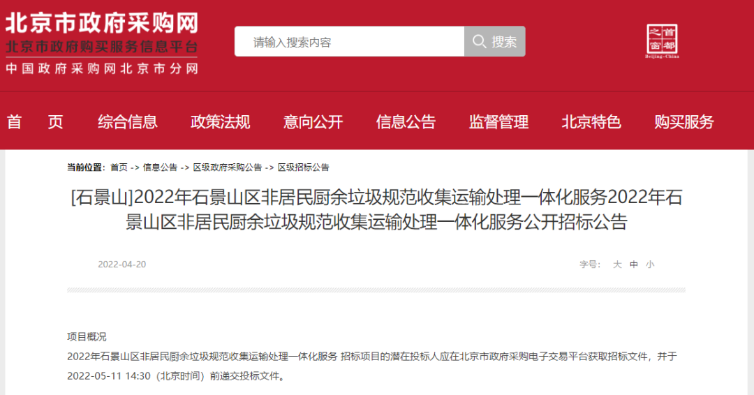 4月20日,北京市政府采購(gòu)網(wǎng)發(fā)布2022年石景山區(qū)非居民廚余垃圾規(guī)范收集運(yùn)輸處理一體化服務(wù)項(xiàng)目的招標(biāo)公告,該項(xiàng)目預(yù)算金額2500萬(wàn)元(不含供應(yīng)商向餐飲單位收取的相關(guān)費(fèi)用)。項(xiàng)目最高限價(jià)收運(yùn)服務(wù)費(fèi)487.29元/噸(含稅),處置服務(wù)費(fèi)331.37元/噸(含稅),收、處合計(jì)達(dá)818.66元/噸,服務(wù)期限...