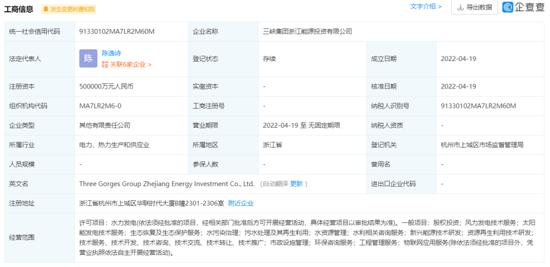 定了!注冊(cè)資本50億,三峽集團(tuán)在浙江成立新公司
