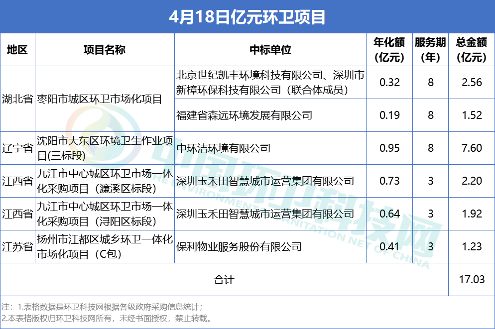 4月18日,有4個(gè)億元環(huán)衛(wèi)項(xiàng)目6個(gè)標(biāo)段在同日公布中標(biāo)結(jié)果,合計(jì)中標(biāo)金額達(dá)17.03億元,中標(biāo)單位包括中環(huán)潔、玉禾田、保利物業(yè)、世紀(jì)凱豐、新樟環(huán)保和森遠(yuǎn)環(huán)境。 沈陽(yáng)市大東區(qū)環(huán)境衛(wèi)生作業(yè)項(xiàng)目(三標(biāo)段) 中標(biāo)單位:中環(huán)潔環(huán)境有限公司; 中標(biāo)金額:9501.4148萬(wàn)元/年; 服務(wù)期限:5+3模式,實(shí)行考核...
