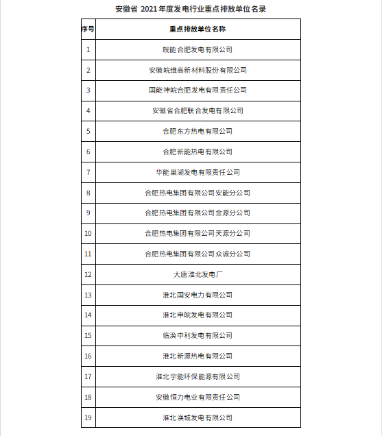 安徽省2021年度發(fā)電行業(yè)重點排放單位名錄公示