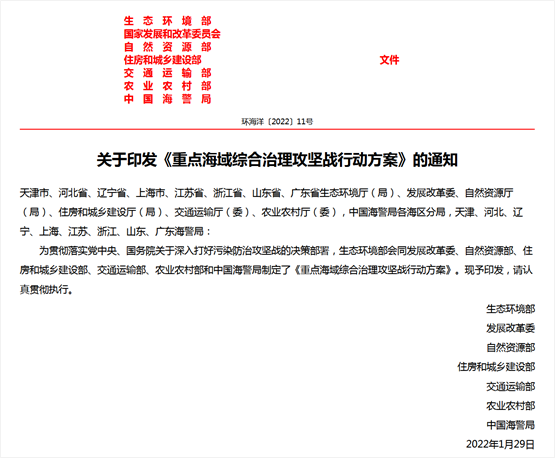 近日,生態(tài)環(huán)境部、發(fā)展改革委、自然資源部、住房和城鄉(xiāng)建設部、交通運輸部、農業(yè)農村部和中國海警局聯(lián)合印發(fā)《重點海域綜合治理攻堅戰(zhàn)行動方案》(以下簡稱《行動方案》),對“十四五”時期渤海、長江口-杭州灣和珠江口鄰近海域等三大重點海域綜合治理攻堅行動的總體要求、主要目標、重點任務和保障措施等作出了部署安排...