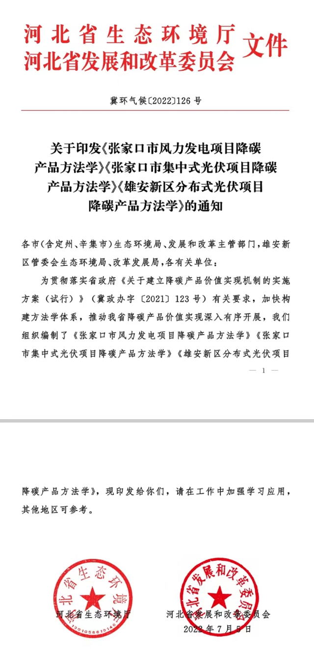 由張家口市生態(tài)環(huán)境局組織編制!全國首個(gè)市級“綠電”降碳產(chǎn)品方法學(xué)獲批發(fā)布實(shí)施?!