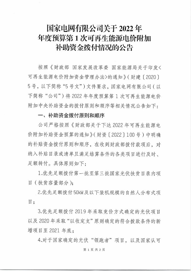 2022年7月15日,國家電網(wǎng)微信平臺發(fā)布“關(guān)于2022年年度預(yù)算第1次可再生能源電價(jià)附加補(bǔ)助資金撥付情況的公告”,提到將對納入補(bǔ)貼或清單且滿足結(jié)算條件的各類項(xiàng)目進(jìn)行及時(shí)、足額轉(zhuǎn)付。 具體來看,2022年年度預(yù)算第1次請款,財(cái)政部共預(yù)計(jì)撥付國家電網(wǎng)可再生能源電價(jià)附加補(bǔ)助資金年...