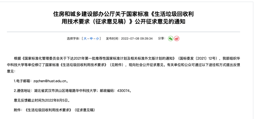 住房和城鄉(xiāng)建設(shè)部就《生活垃圾回收利用技術(shù)要求》等國(guó)家標(biāo)準(zhǔn)公開(kāi)征求意見(jiàn)