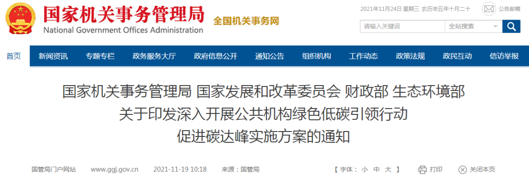 文章導(dǎo)讀11月19日,國(guó)家機(jī)關(guān)事務(wù)管理局、國(guó)家發(fā)展和改革委員會(huì)、財(cái)政部、生態(tài)環(huán)境部四部委發(fā)布《關(guān)于印發(fā)深入開(kāi)展公共機(jī)構(gòu)綠色低碳引領(lǐng)行動(dòng)促進(jìn)碳達(dá)峰實(shí)施方案》的通知。11月19日,國(guó)家機(jī)關(guān)事務(wù)管理局、國(guó)家發(fā)展和改革委員會(huì)、財(cái)政部、生態(tài)環(huán)境部四部委發(fā)布《關(guān)于印發(fā)深入開(kāi)展公共機(jī)構(gòu)綠色低碳引領(lǐng)行動(dòng)促進(jìn)碳達(dá)峰實(shí)...