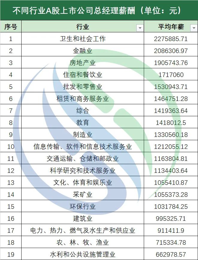 2021年約有4800家A股上市公司發(fā)布年報(bào),但由于總經(jīng)理由董事長兼任等情況,萬得資訊(wind)僅收錄了2907份總經(jīng)理年薪數(shù)據(jù)。中國水網(wǎng)將其中的126家環(huán)保類公司總經(jīng)理年薪數(shù)據(jù)剝離出來,并參考證監(jiān)會(huì)的行業(yè)分類,將剩余的企業(yè)分為了金融業(yè)、房地產(chǎn)業(yè)、制造業(yè)等18個(gè)行業(yè),加上環(huán)保行業(yè),共計(jì)19個(gè)行業(yè),...