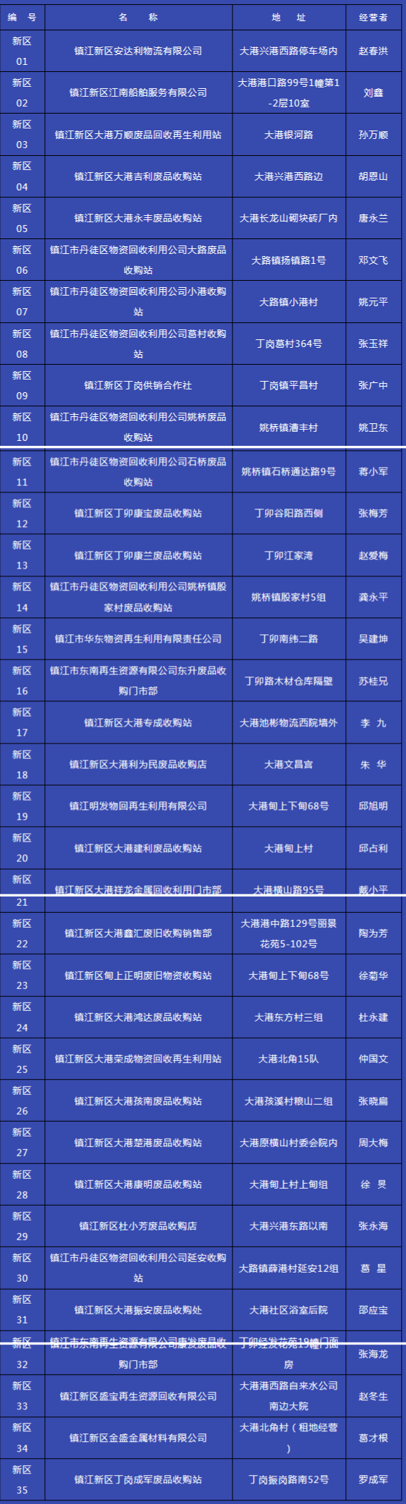 根據(jù)《江蘇省特種行業(yè)治安管理條例》規(guī)定,對生產(chǎn)性收購業(yè)實行名錄管理制度。符合條件的,由所在地市、縣人民政府公安機關(guān)列入名錄,并向社會公布?,F(xiàn)將己列入名錄的35家生產(chǎn)性業(yè)公布如下:期間,上述生產(chǎn)性廢舊金屬收購業(yè)的經(jīng)營名稱、地址、經(jīng)營者等發(fā)生變更的,應(yīng)及時到公安機關(guān)進行報備。市公安局新區(qū)分局二O一八年十...