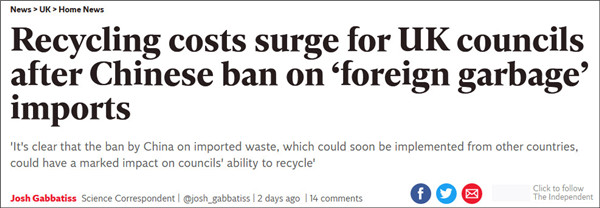 中國自今年1月起為配合新推出的環(huán)境政策,拒收大部分的外國紙類和,英國地方政府對此叫苦連天。根據(jù)調(diào)查發(fā)現(xiàn),因中國等國家決定不再回收來自外國的垃圾,造成2成英國地方政府只能自行救濟(jì)處理垃圾而造成預(yù)算吃緊。當(dāng)?shù)卣粲鯓I(yè)者,應(yīng)共同負(fù)擔(dān)激增的回收成本,并減少使用不易回收的包裝材料。據(jù)《英國獨(dú)立報》10月20...