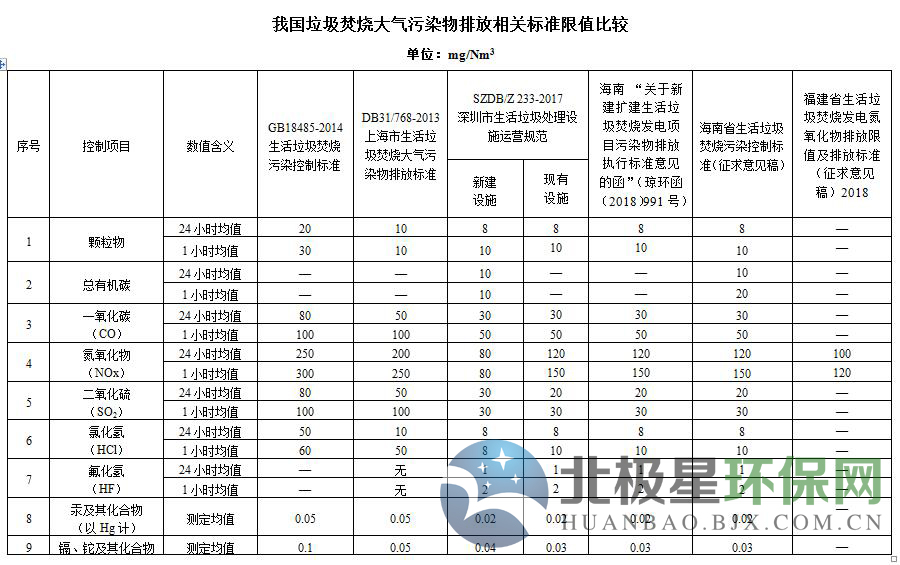 我國垃圾焚燒大氣污染物排放相關(guān)標(biāo)準(zhǔn)限值比較