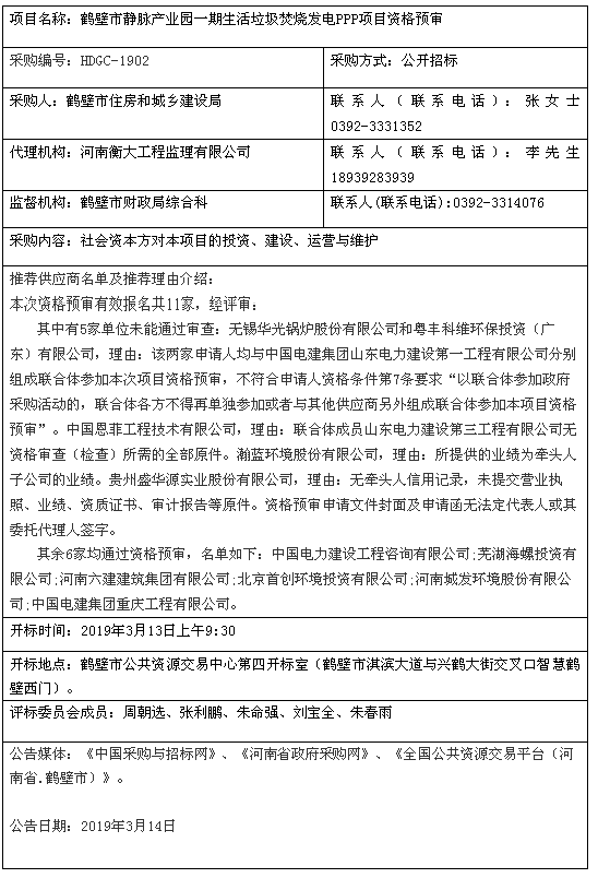 鶴壁市靜脈產(chǎn)業(yè)園一期生活垃圾焚燒發(fā)電PPP項目資格預(yù)審結(jié)果公示推薦閱讀:鶴壁市靜脈產(chǎn)業(yè)園一期生活垃圾焚燒發(fā)電PPP項目資格預(yù)審公告原標(biāo)題:鶴壁市靜脈產(chǎn)業(yè)園一期生活垃圾焚燒發(fā)電PPP項目資格預(yù)審結(jié)果公示
