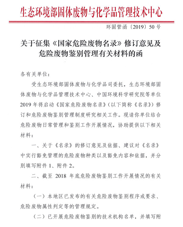 關于征集《國家危險廢物名錄》修訂意見及危險廢物鑒別管理有關材料的函原標題:關于征集《國家危險廢物名錄》修訂意見及危險廢物鑒別管理有關材料的函