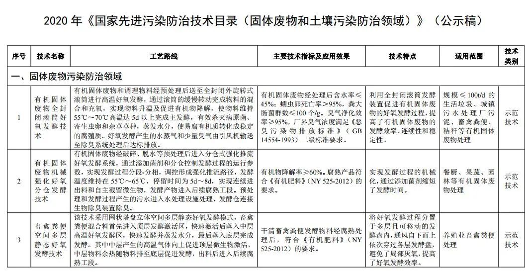 文章導(dǎo)讀日前,生態(tài)環(huán)境部公示《2020年國(guó)家先進(jìn)污染防治技術(shù)目錄(固體廢物和土壤污染防治領(lǐng)域)》。詳情如下:關(guān)于《2020年國(guó)家先進(jìn)污染防治技術(shù)目錄(固體廢物和土壤污染防治領(lǐng)域)》(公示稿)的公示為貫徹《中華人民共和國(guó)環(huán)境保護(hù)法》《中華人民共和國(guó)固體廢物污染環(huán)境防治法》《中華人民共和國(guó)土壤防治法》,...