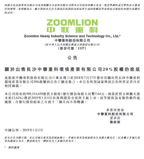 中聯(lián)重科:持有的3.99億股盈峰環(huán)境股份1月4日上市
