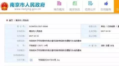 文章導(dǎo)讀 10月19日,南京市政府公布了《南京市低價(jià)值可回收物回收處理暫行辦法》,根據(jù)辦法規(guī)定,城市管理部門負(fù)責(zé)管理轄區(qū)內(nèi)低價(jià)值可回收物回收工作,并通過政府采購(gòu)方式向企業(yè)購(gòu)買低價(jià)值可回收物的回收、處理服務(wù)。辦法自今年11月20日起施行,有效期3年。 《辦法》公布后,南京成為繼廣州之后,又一個(gè)出臺(tái)有關(guān)...