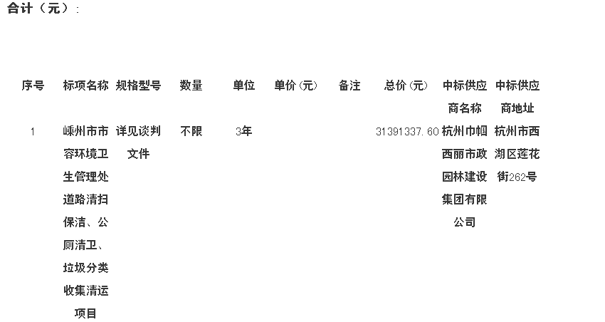 嵊州市公共資源交易中心關于嵊州市市容環(huán)境衛(wèi)生管理處道路清掃保潔、公廁清衛(wèi)、垃圾分類收集清運項目的結果公告一、 采購人名稱:嵊州市市容環(huán)境衛(wèi)生管理處二、 采購項目名稱:嵊州市市容環(huán)境衛(wèi)生管理處道路清掃保潔、公廁清衛(wèi)、垃圾分類收集清運項目三、 采購項目編號:szc2018-71四、 采購組織類型:政府集...