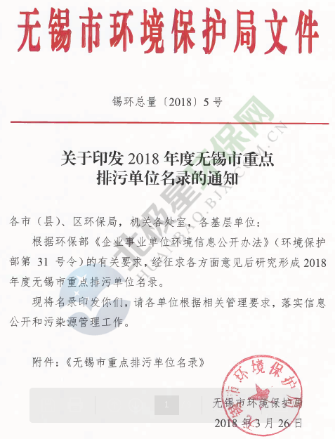 無(wú)錫市環(huán)境保護(hù)局發(fā)布了《關(guān)于印發(fā)2018年無(wú)錫市重點(diǎn)排污單位名錄的通知》,涉及大氣污染物排放、污水處理及工業(yè)固廢處置等排污企業(yè)共180家,具體內(nèi)容如下: