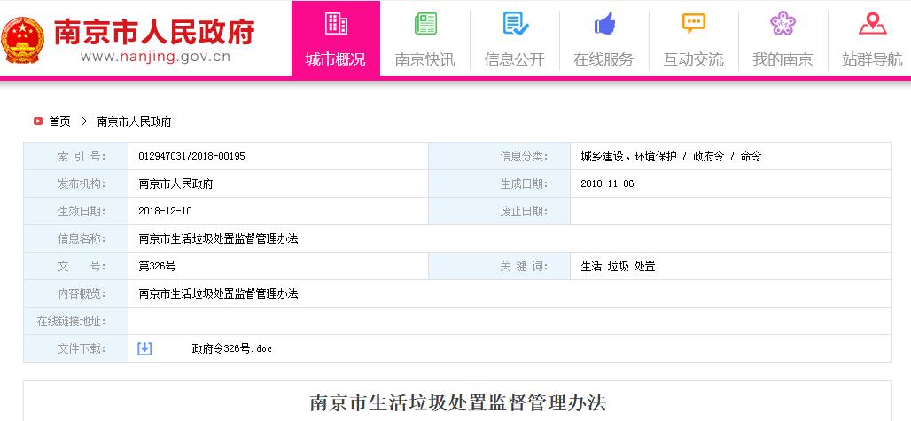 《南京市生活垃圾處置監(jiān)督管理辦法》日前公布,詳情如下:南京市生活垃圾處置監(jiān)督管理辦法第326號《南京市生活垃圾處置監(jiān)督管理辦法》已經(jīng)2018年10月31日市政府第23次常務會議審議通過,現(xiàn)予公布,自2018年12月10日起施行。市長:藍紹敏2018年11月6日南京市生活垃圾處置監(jiān)督管理辦法第一章 總...