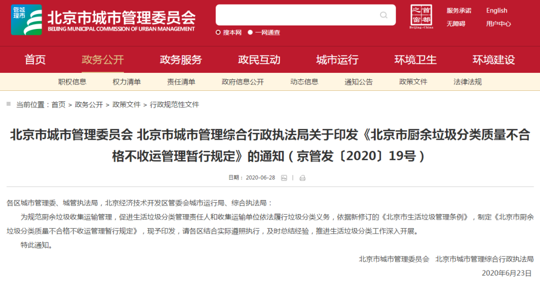 文章導(dǎo)讀為規(guī)范廚余垃圾收集運輸管理,促進生活垃圾分類管理責(zé)任人和收集運輸單位依法履行垃圾分類義務(wù),依據(jù)《北京市生活垃圾管理條例》,制定《北京市廚余垃圾分類質(zhì)量不合格不收運管理暫行規(guī)定》。為規(guī)范廚余垃圾收集運輸管理,促進生活垃圾分類管理責(zé)任人和收集運輸單位依法履行垃圾分類義務(wù),北京市城市管理委員會 北...