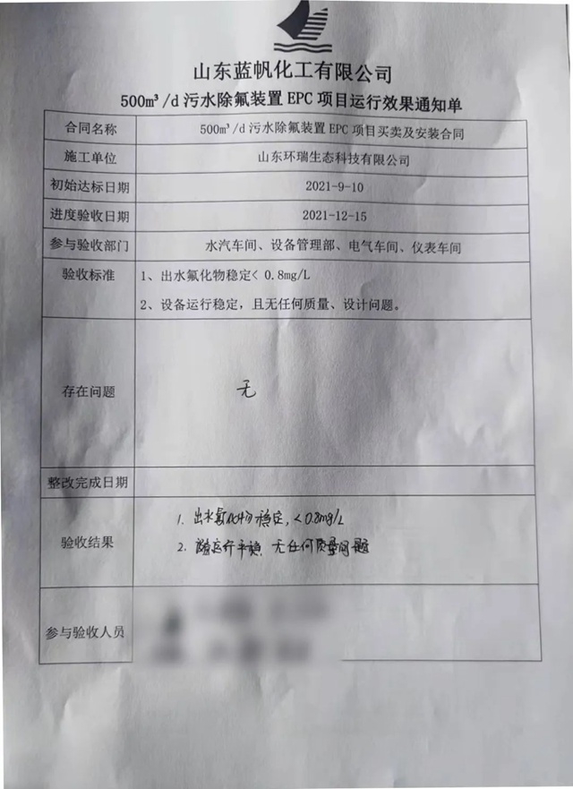 2021年12月15日,環(huán)瑞生態(tài)深度除氟<0.8mg/L項(xiàng)目——《藍(lán)帆化工煤造氣廢水深度除氟項(xiàng)目》順利通過(guò)竣工驗(yàn)收! 項(xiàng)目運(yùn)行效果通知單 經(jīng)過(guò)三個(gè)月的艱苦奮戰(zhàn),順利完工驗(yàn)收,系統(tǒng)連續(xù)運(yùn)行三個(gè)月出水完全達(dá)標(biāo),出水氟離子濃度穩(wěn)定<0.8mg/L,且無(wú)裝置設(shè)備運(yùn)行質(zhì)量問(wèn)...