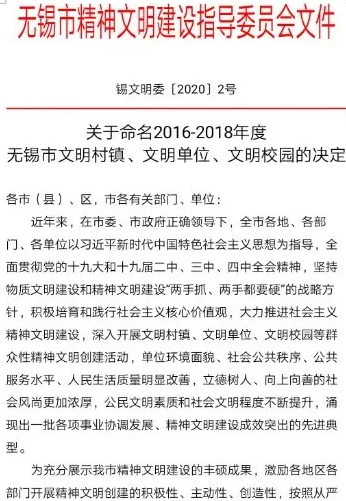 近日,根據(jù)無錫市精神文明建設指導委員會下發(fā)文件錫文明委〔2020〕2號《關于命名2016—2018年度無錫市文明村鎮(zhèn)、文明單位、文明校園的決定》,華光股份、市政設計院、友聯(lián)熱電被授予 2016-2018年度“無錫市文明單位”稱號。 近年來,華光股份在無錫市文明辦等...