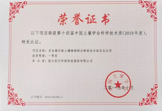 2019年10月,經(jīng)中國土壤學(xué)會項目評選委員會評審決定,航天凱天環(huán)??萍脊煞萦邢薰九c中山大學(xué)、廣東省耕地肥料總站聯(lián)合申報的“多金屬污染土壤植物聯(lián)合修復(fù)技術(shù)體系及應(yīng)用”獲中國土壤學(xué)會科學(xué)技術(shù)獎一等獎。 該技術(shù)體系將航天凱天環(huán)保自主研發(fā)的重金屬土壤修復(fù)技與中山大學(xué)研發(fā)的多金屬污...