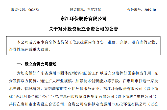 2019年1月24日,東江環(huán)保股份有限公司董事會發(fā)布公告稱,擬出資成立合資公司,打造一家專業(yè)化的環(huán)保服務(wù)企業(yè)。 公告顯示,東江環(huán)保擬與與惠州市投資管理集團有限公司(簡稱“慧投公司”)共同出資在惠州市成立合資公司,公司名擬定為“惠州市東投環(huán)保有限公司”,...
