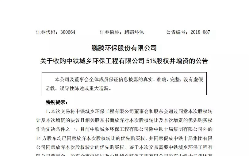11月19日,鵬鷂環(huán)保股份有限公司開了第二屆董事會(huì)第十八次會(huì)議,審議通過了《關(guān)于收購中鐵城鄉(xiāng)環(huán)保工程有限公司51%股權(quán)并增資的議案》,同意公司收購中鐵城鄉(xiāng)環(huán)保工程有限公司(以下簡(jiǎn)稱“中鐵環(huán)保”或“標(biāo)的公司”)51%股權(quán)并對(duì)其進(jìn)行增資,其中股權(quán)轉(zhuǎn)讓價(jià)款4...