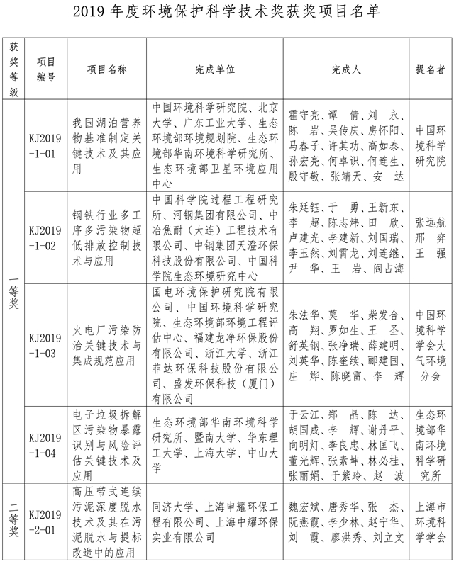 根據(jù)《環(huán)境保護(hù)科學(xué)技術(shù)獎勵辦法》的規(guī)定,經(jīng)有關(guān)專家、單位提名和專家評審,并通過廣泛公示,環(huán)境保護(hù)科學(xué)技術(shù)獎勵委員會批準(zhǔn)39個項目獲2019年度環(huán)境保護(hù)科學(xué)技術(shù)獎,其中:一等獎4項,二等獎33項,科普類獎2項。 附:2019年度環(huán)境保護(hù)科學(xué)技術(shù)獎獲獎項目名單 環(huán)境保護(hù)科學(xué)技術(shù)獎勵辦公室 2019年12...