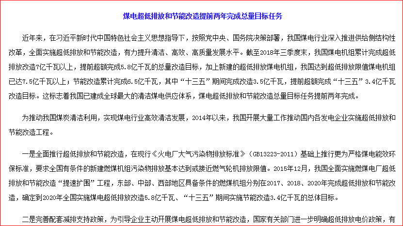 2014年以來,為了推動我國煤炭清潔利用,實(shí)現(xiàn)煤電行業(yè)高效清潔發(fā)展,我國開展大量工作推動國內(nèi)各發(fā)電企業(yè)實(shí)施超低排放和節(jié)能改造工程,大大提升了煤電行業(yè)清潔、高效、高質(zhì)量的發(fā)展水平。 根據(jù)國家能源局公開的數(shù)據(jù),截至2018年第三季度末,我國煤電機(jī)組累計(jì)完成超低排放改造7億千瓦以上,提前超額完成5.8億千...