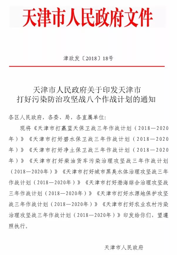 今年起三年攻堅(jiān)戰(zhàn)應(yīng)該怎么打?市劃出了最新“時(shí)間表”“路線(xiàn)圖”。天津市政府昨天發(fā)布《關(guān)于打好八個(gè)作戰(zhàn)計(jì)劃的通知》,標(biāo)志天津市今起全面打響藍(lán)天、碧水、凈土等三年八大戰(zhàn)役。該通知包括了藍(lán)天保衛(wèi)戰(zhàn)、碧水保衛(wèi)戰(zhàn)、凈土保衛(wèi)戰(zhàn)、柴油貨車(chē)污染治理、城市黑臭水體治理、渤海綜合治理、水源地保護(hù)、農(nóng)業(yè)農(nóng)村污染治理等8方面...