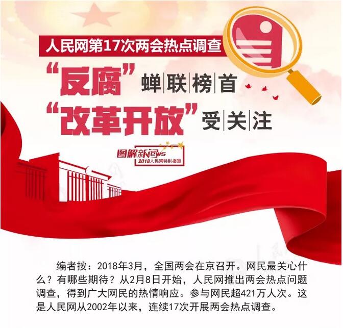 2018年3月,全國兩會將在北京召開,網(wǎng)民最關(guān)心什么?有哪些期待?而隨著的頻繁出臺,人民對碧海藍天的渴望更加強烈,問題也愈發(fā)引起人民的關(guān)注。人民網(wǎng)推出的兩會熱點調(diào)查中,“環(huán)境保護”進入前十名榜單,成為備受關(guān)注的熱點問題,而且其于2014-2018年五次上榜。 來源:人民網(wǎng)圖解新聞