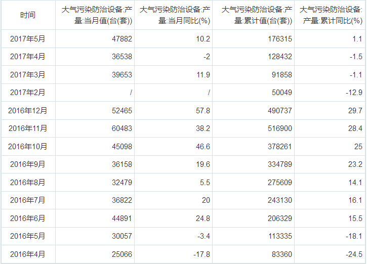 今年是“”第一階段的收官年。在國家政策與一系列舉措的高壓下,我國大氣污染治理情況取得了不小的成績,環(huán)保裝備也迎來難得發(fā)展良機(jī),2021年產(chǎn)量將達(dá)到64.4萬臺。數(shù)據(jù)顯示,2017年5月我國產(chǎn)量47882臺,當(dāng)月同比上漲10.2%,1-5月累計產(chǎn)量176315臺,累計同比上漲1.1%。預(yù)計2017年中...