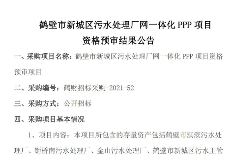 固始縣污水處理設(shè)施PPP項目社會資本方采購 資格預(yù)審公告 項目概況 固始縣污水處理設(shè)施PPP項目招標(biāo)項目的潛在資格預(yù)審申請人應(yīng)在凡有意參加投標(biāo)者,憑CA數(shù)字證書登錄《全國公共資源交易平臺(河南省固始縣)》會員系統(tǒng)進(jìn)行網(wǎng)上報名并下載資格預(yù)審文件;領(lǐng)取資格預(yù)審文件,并于2021年11月19日08時30分...