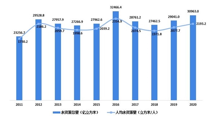 本文核心數(shù)據(jù):中國水資源總量及人均水資源量、全國流域總體水質(zhì)狀況、重點監(jiān)測胡泊(水庫)水質(zhì)分布、國家級地下水和淺層地下水水質(zhì)情況 政策助力水治理行業(yè)發(fā)展 2011-2020年,我國水資源總量整體呈現(xiàn)波動變化的趨勢,與此同時,人均水資源量也處于不穩(wěn)定狀態(tài),2020年為2193.2立方米/人。按照國際公...