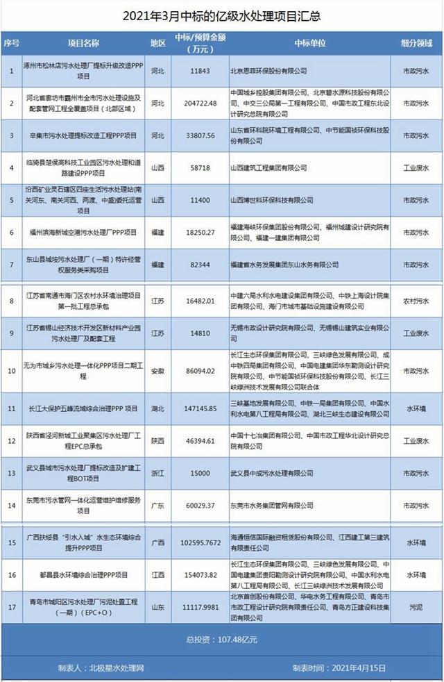 經(jīng)歷了(2021年)2月億級(jí)水處理項(xiàng)目中標(biāo)數(shù)量的斷崖式下降,3月落地水處理項(xiàng)目數(shù)量翻倍,達(dá)到17個(gè),但因10億級(jí)大單數(shù)量較少,所以總投資額與2月基本持平,達(dá)107.48億元,細(xì)分領(lǐng)域主要集中在市政污水和水環(huán)境,工業(yè)廢水主要聚焦于園區(qū)。最大一單被中交+碧水源攜手拿下,而三峽集團(tuán)依然所向披靡,拿下近40...